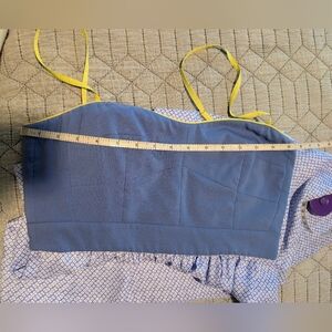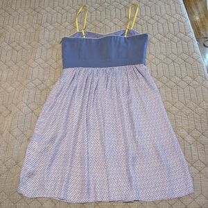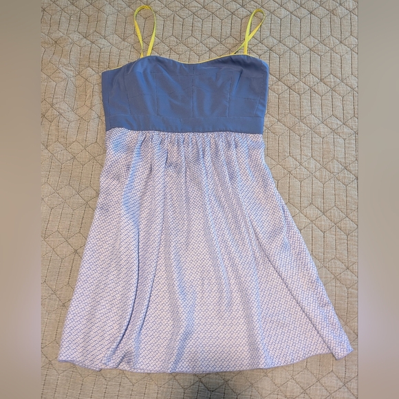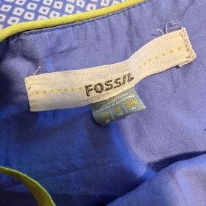 Silky textured Fossil blue dress with yellow green straps. The top is lined. Great condition
