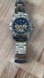 Description: Blue chronograph style dial with gold-tone day and date dial. Two-tone stainless steel bracelet with fold-over clasp. Gold tone and luminous hands and markers. Just cleaned and serviced with a new battery installed. Works well!