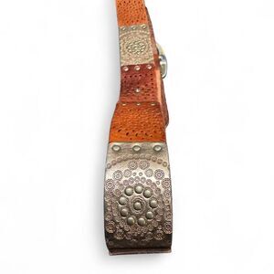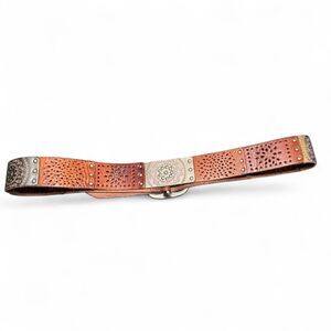 Genuine Fossil leather belt with solid brass buckle and intricate perforated and studded designs. Warm tan/caramel leather with boho, western, and hippie vibes—perfect for jeans, skirts, or layering over dresses. Great festival accessory with timeless Fossil quality.