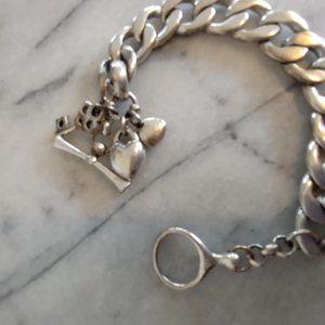 Pre owned chunky silver Fossil bracele tin a brushed finish. Toggle closure with cute fossil charms. Rhinestone heart lock with mini key.
