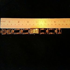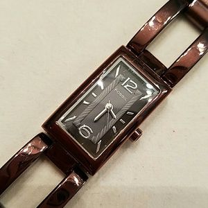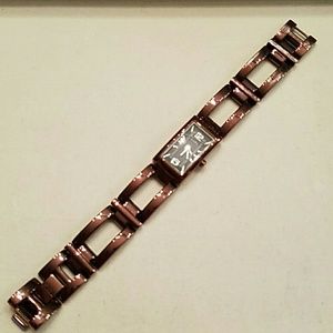 Brown stainless steel link bracelet watch with black face. Gently used. Has some buff marks on some of the links. Requires new battery.