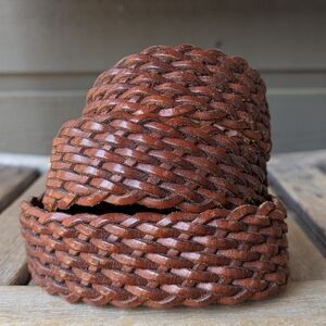 Great preowned condition braided brown leather belt with medallion buckle from Fossil. Genuine leather. Medallion buckle shows wear (pictured in closeup). Leather is in perfect condition. Easily fits waists up to 33"