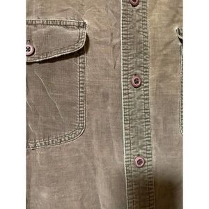Fossil Brand Corduroy long sleeve, button down, XL , brown , shirt. It has 2 front pockets, 100% cotton and extra button. I took pictures of blemishes on the shirt but part of them may a distressed look , the shirt is as a whole in good condition and is really soft.