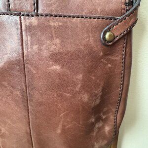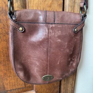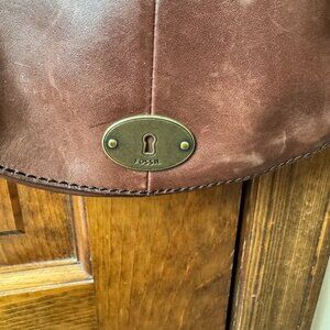 Fossil; Crossbody Bag; Brown; Saddlebag; Leather; Fabric Lining; Adjustable Crossbody Strap; Hidden Magnetic Close w/Buckle; Interior Back: Zipper Close Pocket w/Leather Logo Patch; Interior Front: Slip Pocket with Leather Trim; Brass Hardware; 8"L x 2"W x 9"H; Strap Up to 27" Drop
