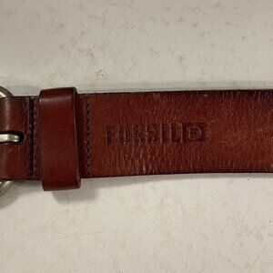 Belt is plain leather with the Fossil logo embossed in the leather by the buckle.