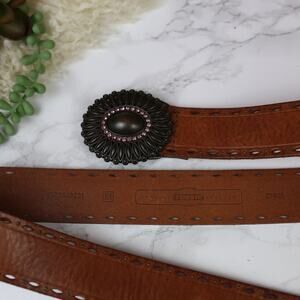 Fossil Brown Leather Belt Boho Victorian Metal Buckle Pink Rhinestone Medium