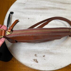 Authentic Fossil leather crossbody in rich brown with gold-tone accents. Style SHB2969. Features adjustable strap, zip closure, and multiple compartments for everyday organization. Classic Fossil quality with a casual boho vibe that pairs well with jeans, dresses, or office wear.