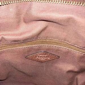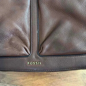 Features: Brown leather, Crossbody strap, 2 front pockets, Zipper closure, Fossil logo