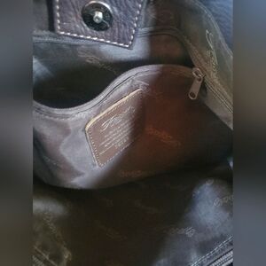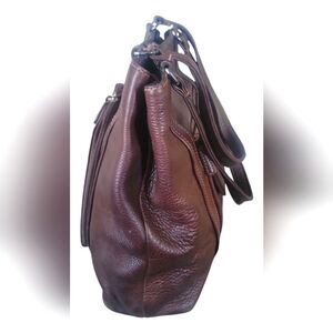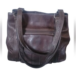 Elegant Fossil tote in rich brown leather. Features front zip pocket. Perfect for everyday use.