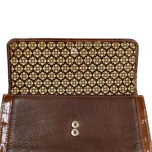 Keywords: Fossil wallet, brown leather wallet, snap closure wallet, floral interior wallet, women's wallet, clutch wallet, leather clutch, Fossil, card holder, zippered wallet, brown wallet, leather, accessories, wallet