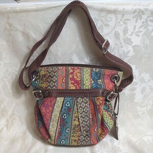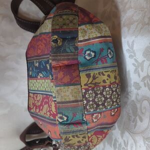 Perfect for boho or festival look. Multi colored fabric with adjustable leather and fabric strap. Key and luggage tag attached. Fabric could use a little cleaning especially on bottom but use right away.