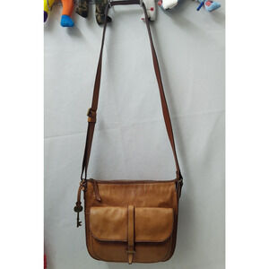 Fossil Brown Tan Leather Front Pocket Zipper Closure Crossbody Bag