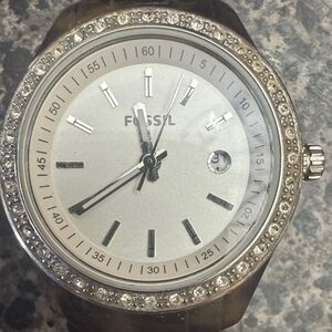 Stylish Fossil watch featuring a brown tortoise shell band. Silver dial with crystal accents.