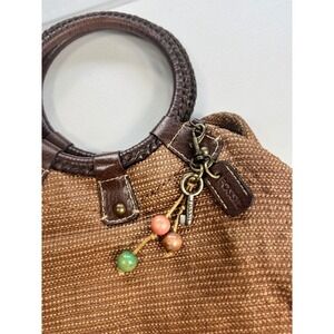 Fossil Brown Woven Circle Handle Satchel Bag Charm Floral Interior