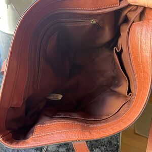Fossil brown leather tote, 2 side water bottle pockets and small zip pockets, interior zip pocket and accessory pockets. Easily fit laptop.