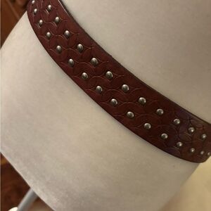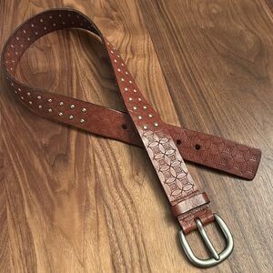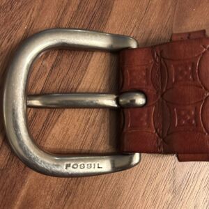 Fossil Brown Textured Leather Belt with Silver Grommets and Buckle. No size markings. Leather measures 36.5”; Buckle, 2".
