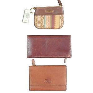 Yhe larger wallet is 7 in x 4 the medium size wallet is 5.5x4 and the pouch is 5 in x 3.5