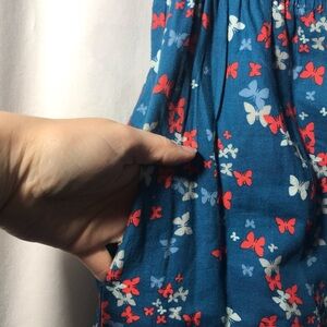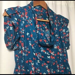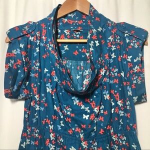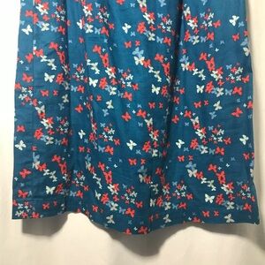 Fossil Butterfly Print Organic Cotton Blend Dress. Organic cotton 35%, cotton 65%. Comes with extra button. Teal background with blue, light blue and blood orange butterflies. Semi cowl neck. Button detail on shoulders. 2 side pockets. Size small. Elastic waist. Busy is 19” across the front. Center back length starting just under the collar is 35”