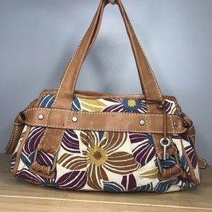 Fossil Canvas and Leather Floral Shoulder Bag. There are some marks on the handles, one large one. It looks like a wet spot, but its not. The inside is in really nice shape.