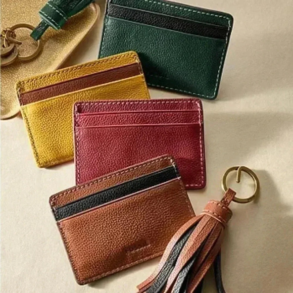This leather card case key fob set features 1 slide pocket, 4 credit card slots.