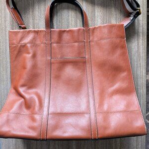 Leather Fossil tote with adjustable and removable strap. Smaller handles attached. Clean interior with zip pocket and multiple slip pockets. Outer slip pocket. Magnetic closure.