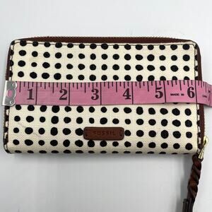 Fossil Caroline RFID Zip-Around Wallet Black Polka Dot Brown Leather Trim