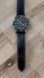 Description: Beautiful black chronograph dial with date window. Rotating bezel. Black genuine leather strap. Copper and luminous hands and markers. Just cleaned and serviced with a new battery installed. Works well!