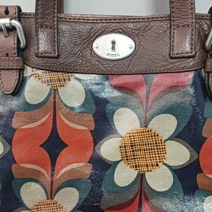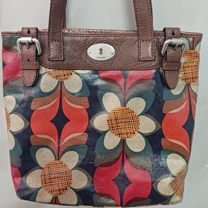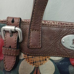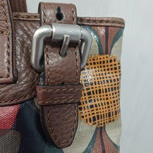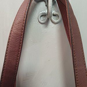 GUC, All leather trim, some fabric wear in bottom corners, straps are leather reinforced with heavy cotton cording, silver hardware with logo, 1 inside zip and 2 pouch pockets. A few stains on inside liner.