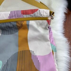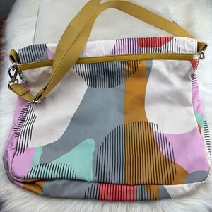 FOSIL Stylish messenger bag with a colorful abstract design. Features red, pink, gray, and tan patterns.
