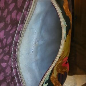 Vintage Vibrant Fossil Calypso crossbody with a unique camouflage pattern. Features a playful mix of colors and a decorative key charm. Coated canvas. Approximate measurements 10x11. Excellent used condition.
