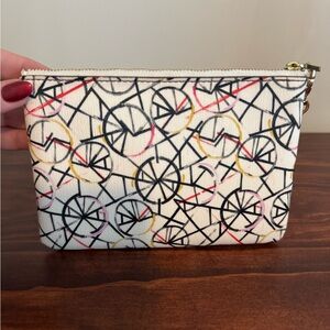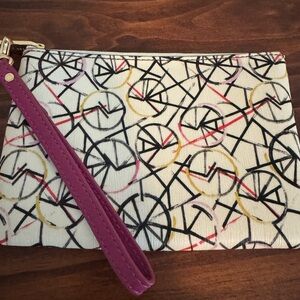 Chic Fossil wristlet with a unique geometric pattern. Cream base with a bold purple strap. Ideal for versatile styling.