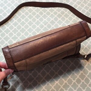 Shows some signs of wear such as denim staining on back. Normal wear to leather and metal accents.