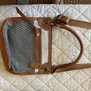 Barely used Fossil crossbody bag. Natual leather. Strap in natural color, adjustable strap. Navy and creme color tweed design. 10 inches high. 12 inches wide. Bottom of the bag opens to 4 inches.