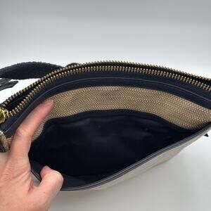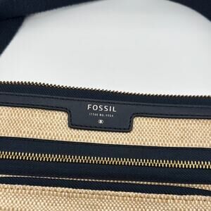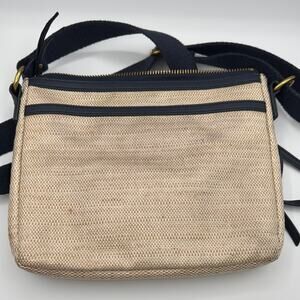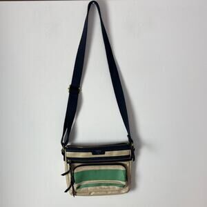 Gently Used Fossil Crossbody Bag. Exterior is like a coated cloth material. Off white with green and blue stripe accents. Fossil badge. Multiple exterior pockets with zippers. Zips closed. Several interior pockets as well. Nice bag!