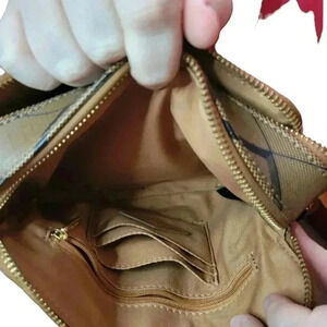 Double Zipper Opening with a Outside Pocket w/ Snap, Has Card Holder Pockets on One Side , Other Side has Slip Pocket, Adjustable Stap, 8in Wkide X 7in Tall