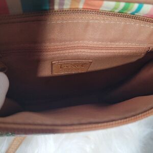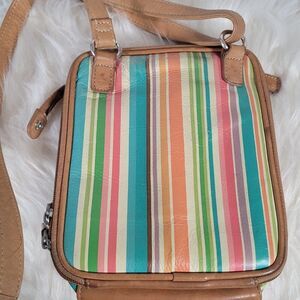 Lots of Pockets for phone and credit cards! Tan leather and striped in spring colors. This has a little bit of wear at the back side of the bag at the top. See photo. But otherwise, this is in pretty good shape! Leather strap is adjustable, hardware is silver.