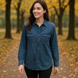 Fossil Denim Button-Up Shirt Size L – Classic Blue Long Sleeve Chambray Top