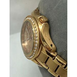 with crystals. Rose gold dial with rose gold-tone hands and stick hour markers.