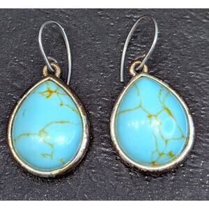 Fossil Earrings, Turquoise-color Stone, Teardrop, Silver-tone Lattice Back, Hook