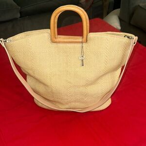 Fossil Elegant Tan Woven Tote Bag with Wooden Handles and Long Strap