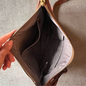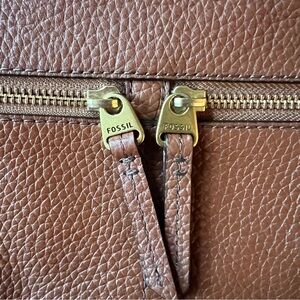 Fossil Elise crossbody in caramel brown. Two front zipper pockets. Perfect classic Fossil crossbody!
