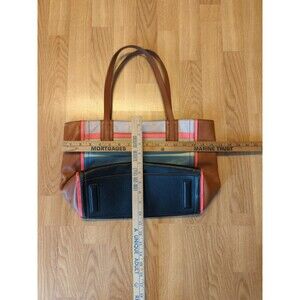 This Fossil Emma Tote Shoulder Bag is a stylish accessory for any woman. The multicolor patchwork leather exterior is complemented by brown fabric lining and brass hardware. The bag features a zip closure, bottom studs, and inner pockets for added convenience.