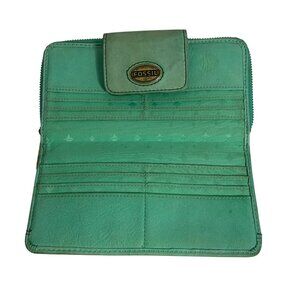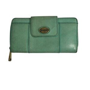 Fossil Explorer Womens Teal Leather Bifold Wallet Zip-Around Clutch Snap Flap