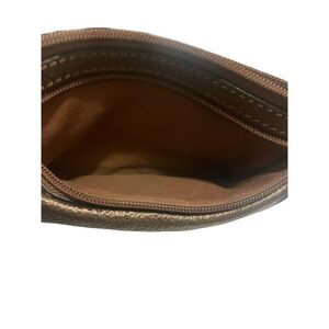 Metallic bronze, soft soft leather, card slots, ID and coin section, top zip closure, front snap closure and signature logo
