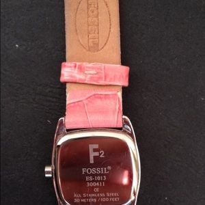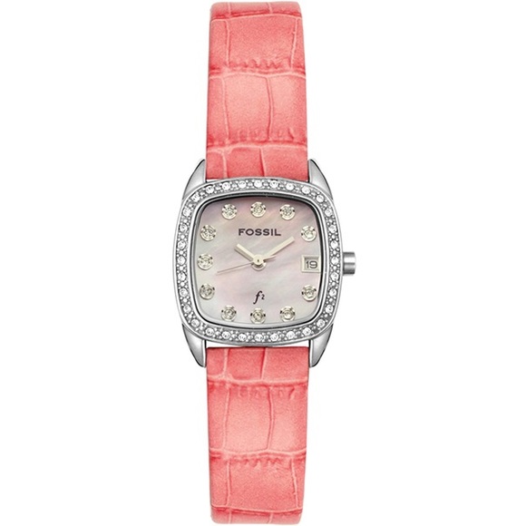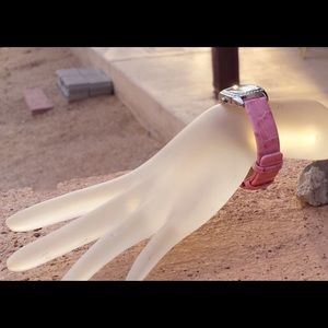 GLASS CLEAN,AND CLEAR,MOTHER OF PEARL DIAL,WITH INLAID CRYSTALS,STAINLESS STEEL CASE,FRAMED BY INLAID CRYSTALS,HAS No scratches. Also shows date. Watchband with pink EMBOSSED LEATHER. Water resistant.