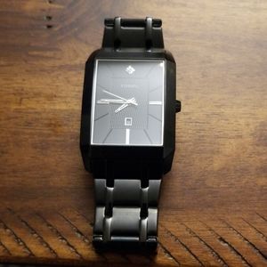 Black-plated stainless steel case and bracelet. Fixed black-plated bezel. Black dial with silver-tone hands and batton markers at the quarter hour positions. Diamond set at the 12 o'clock position. Dial Type: Analog. Quartz movement. Scratch resistant mineral crystal. Pull / push crown. Solid case back. Case dimensions: 34 mm x 45 mm. Case thickness: 10 mm. Rectangle case shape. Band width: 28 mm. Fold over clasp. Water resistant at 50 meters / 165 feet. Casual watch style.