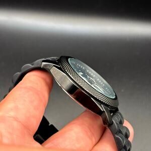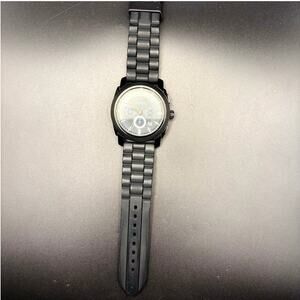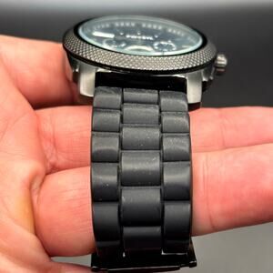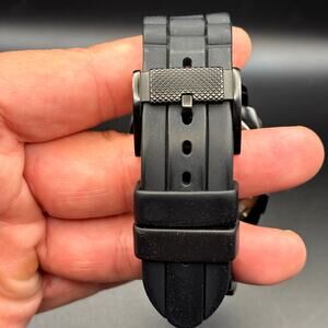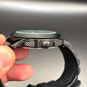The Fossil Machine FS4487 S/N 251512 delivers a bold industrial aesthetic with a gunmetal stainless steel case, textured bezel, and matte black dial featuring chronograph subdials and a date window for everyday functionality. Powered by a reliable quartz chronograph movement, this men’s timepiece is paired with a comfortable black silicone strap that has been restored with UV protectant to help prevent fading and future cracking, maintaining its deep finish and flexibility. This new,store showcase piece show minor signs of shelf handling from customers testing the functions. The watch has been fully cleaned, fitted with a new battery, gasket lubricated, and tested to ensure excellent performance and dependable timekeeping. Overall case integrity and function are prime, making this a sharp, ready-to-wear example of Fossil’s rugged Machine design.