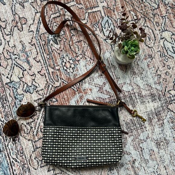 Fossil Fiona Crossbody Bag Coated Canvas Key Print Stripe Black White Brown
