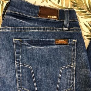 Stretchy, some distressed areas , some wearing on bottom hem see photos