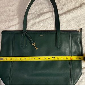 Elegant Fossil tote in forest green. Features durable leather and comfortable handles. Perfect for everyday style.